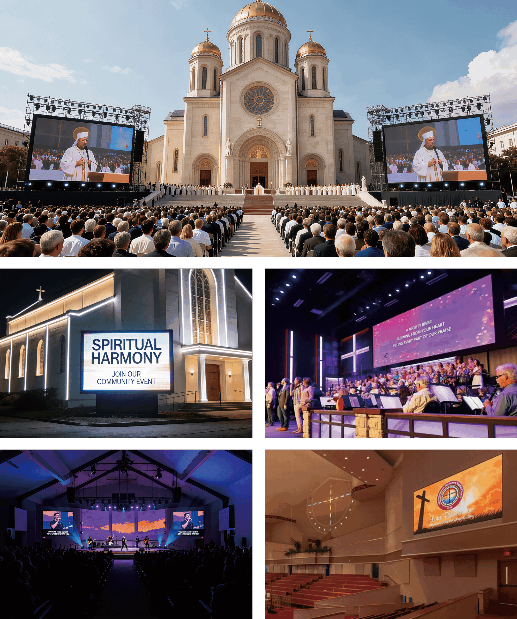 Today's church LED display solutions provide a powerful way to enrich worship and strengthen community connection. Whether installed in the sanctuary, lobby, or outdoor areas, these versatile screens bring sermons, hymns, and announcements to life with high-resolution clarity. Designed for easy installation and flexible use, they support a wide range of church activities and can be quickly set up or reconfigured for special events or outreach. With high brightness and weather-resistant features, LED displays ensure clear communication in any environment, creating a more engaging and inspiring worship experience for all attendees.